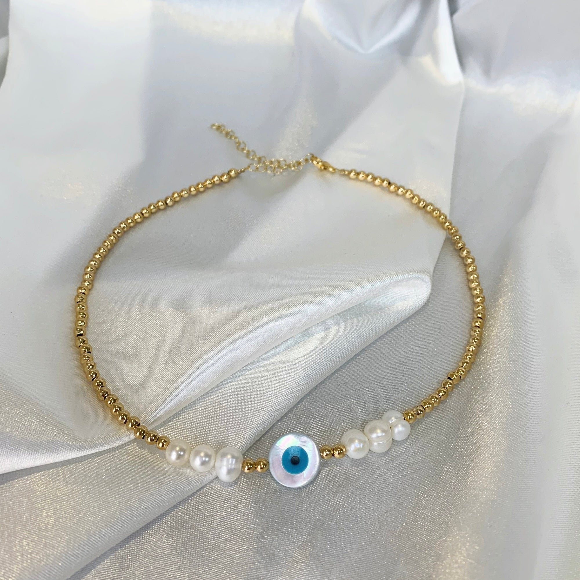 Collar mediano bolitas de chapa de oro 18K con perlas naturales y ojo madre perla