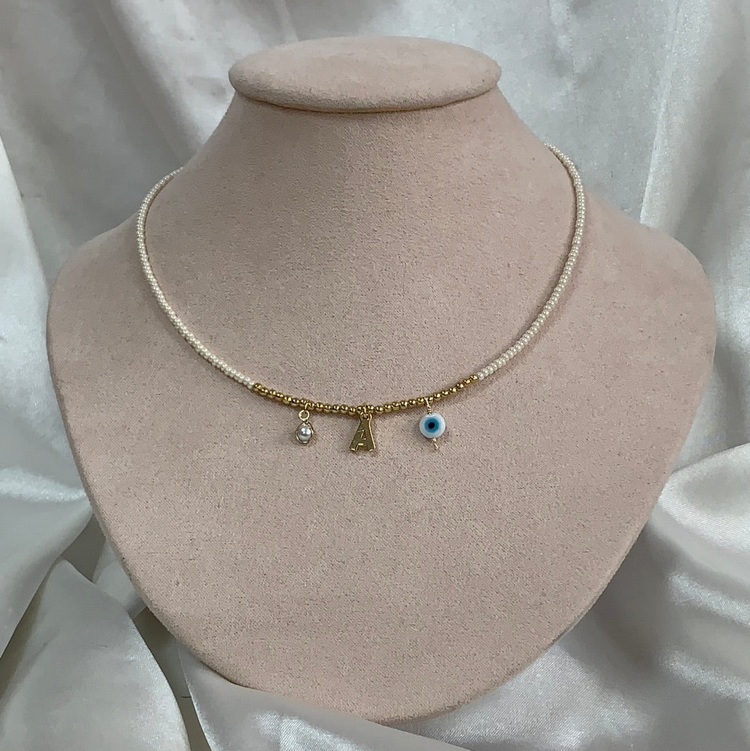 Choker chaquira beige con bolita Chapa, Perla colgante y ojito celeste