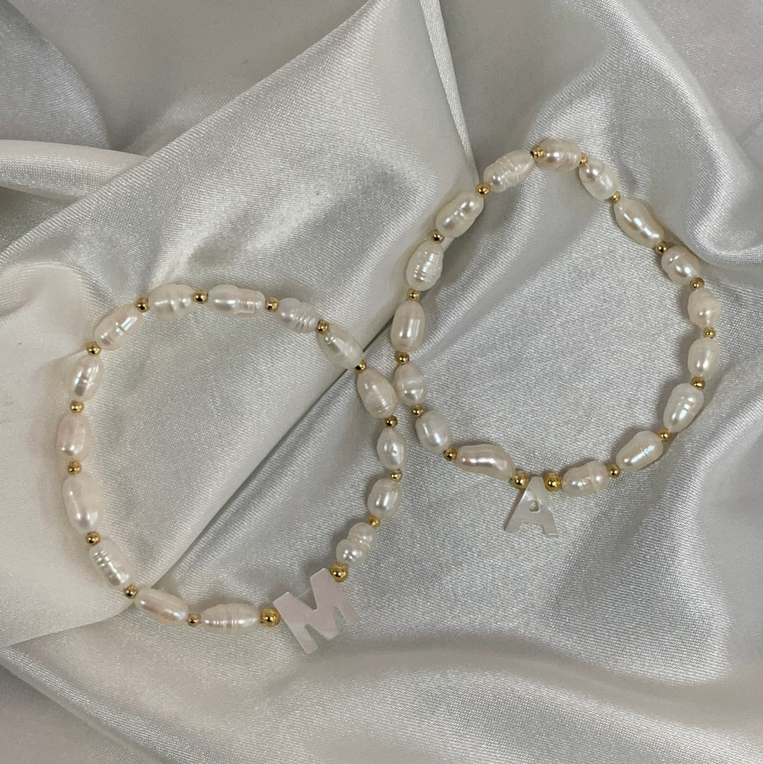 Incluye: Hilo elástico, perlas naturales, bolitas de chapa de oro e inicial elegida + bolsita de regalo.