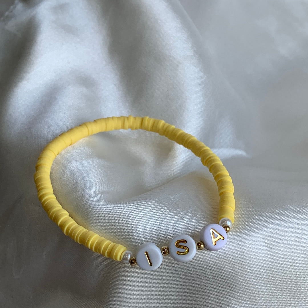 Incluye: Hilo elástico, pucas del color elegido e iniciales elegidas + bolsita de regalo.