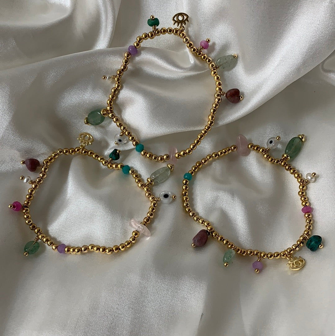 Pulsera bolitas chapa de oro y piedritas naturales.