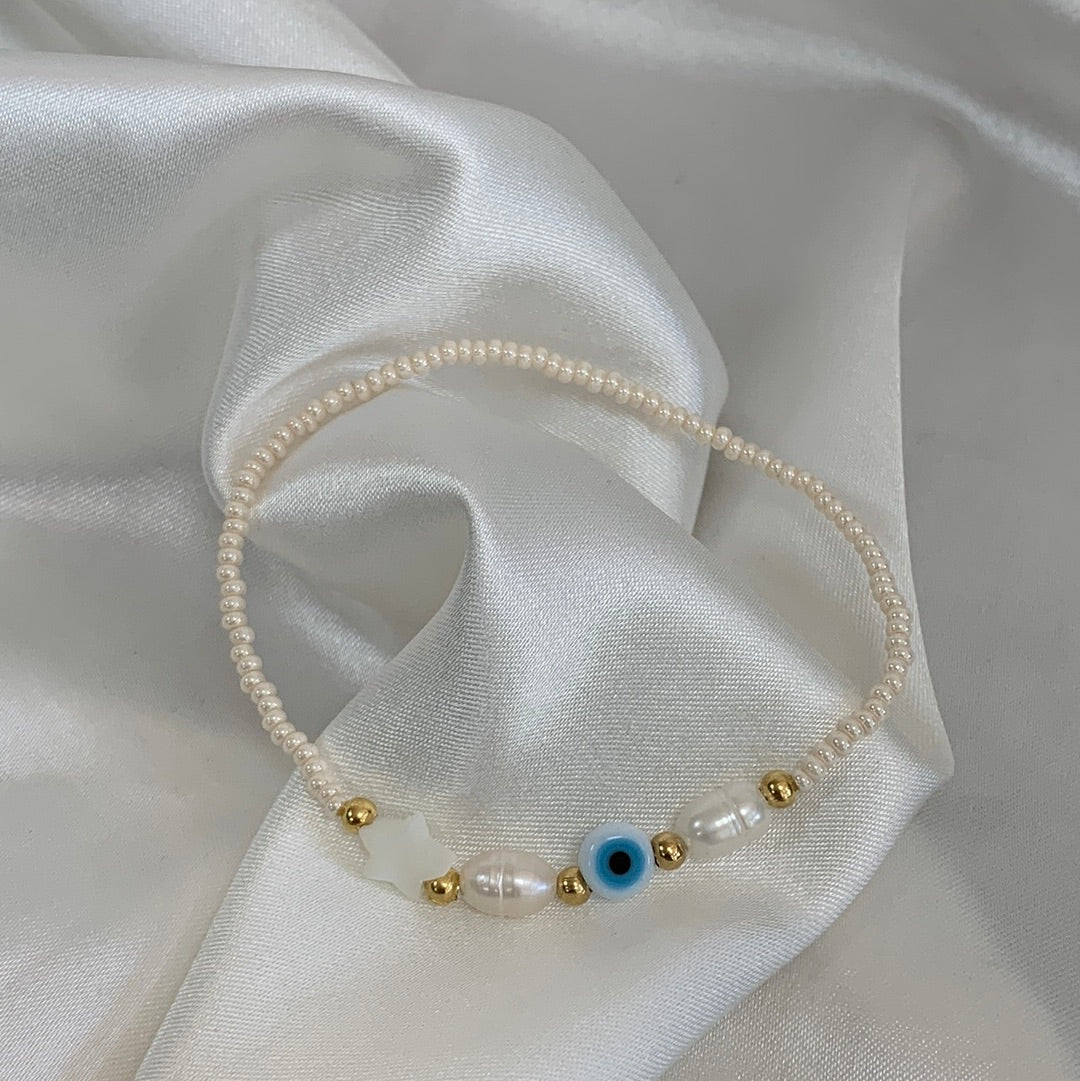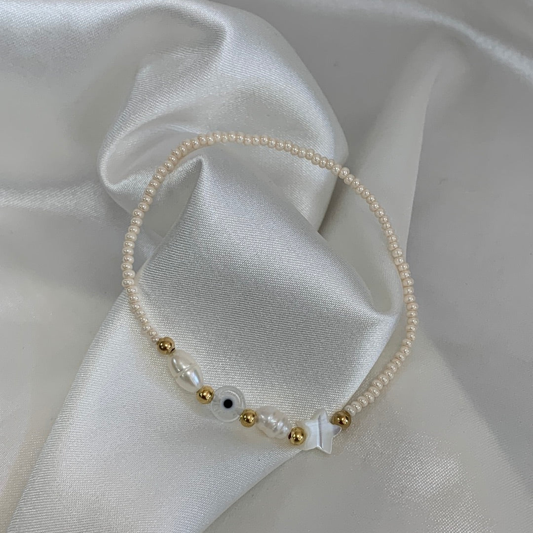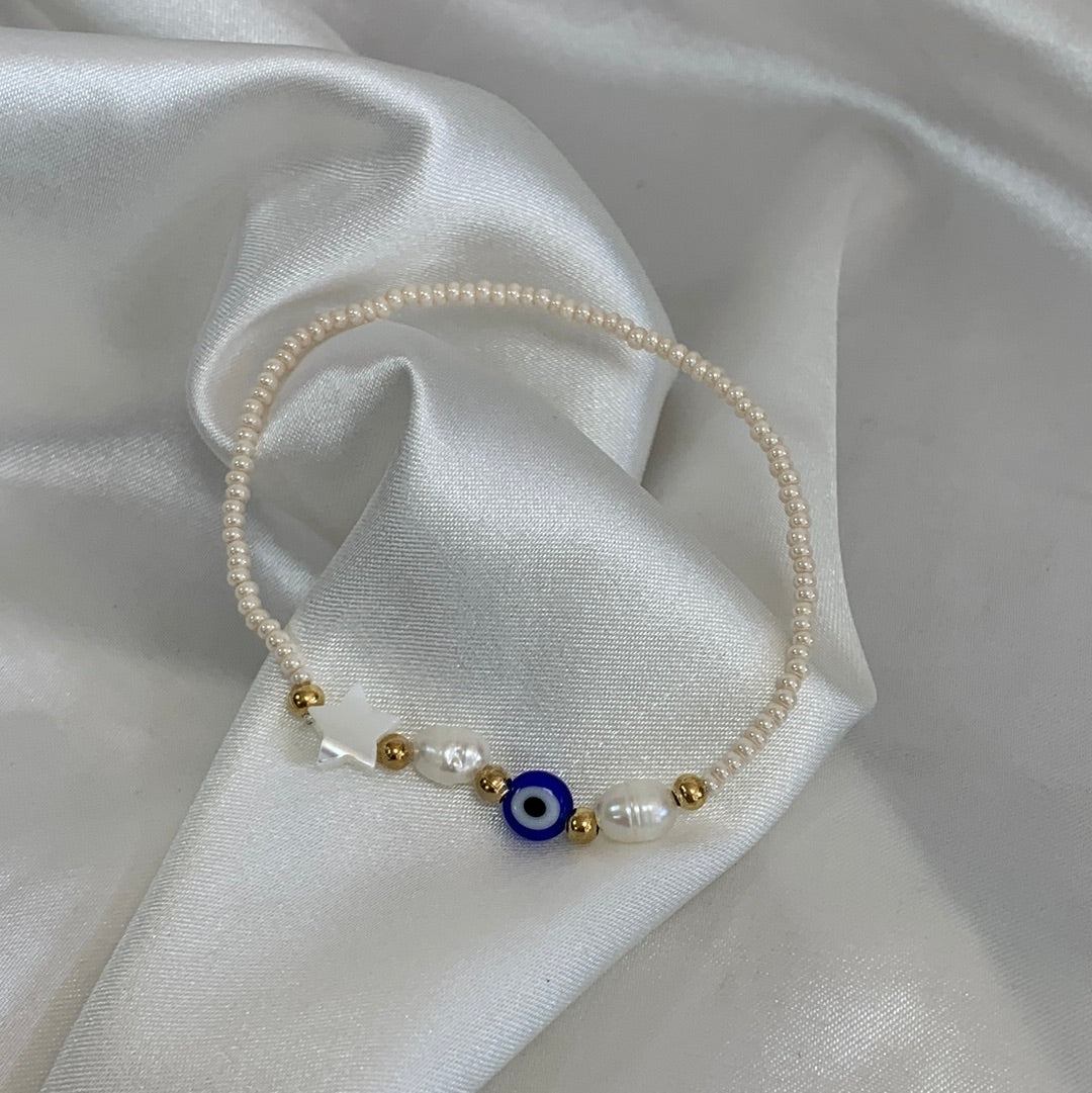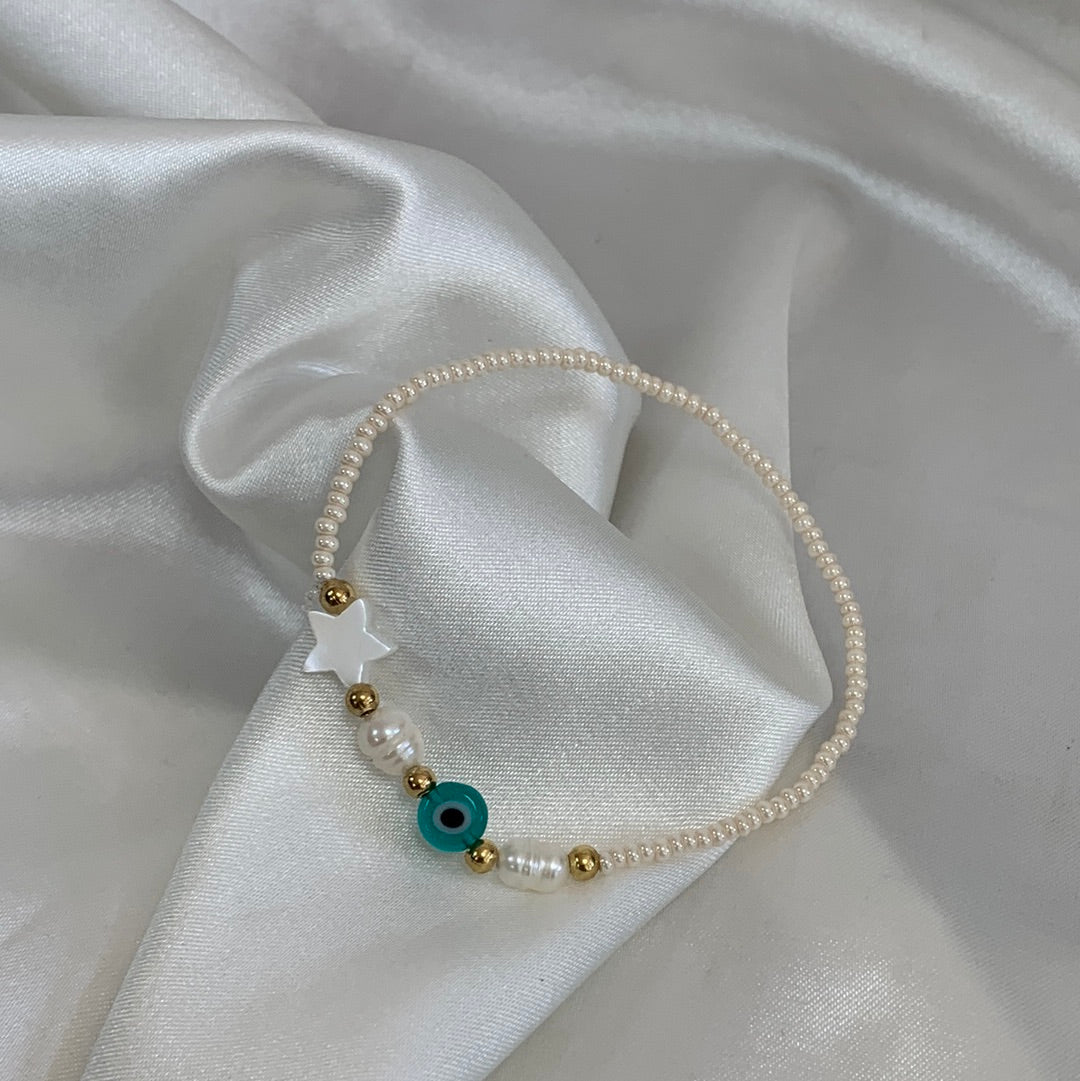 Pulsera chaquiras, perlas, Estrella madre perla y ojo.